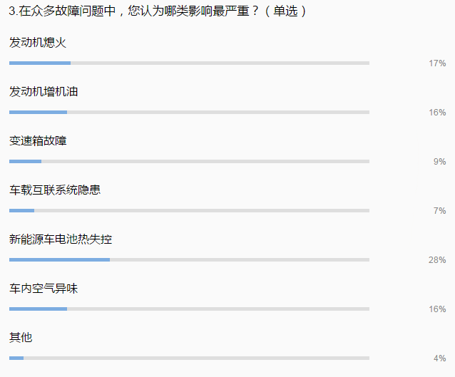 因此,在调研问题3中,当被问及“众多故障问题中,哪类影响最严重”时,28%的参与者毫不犹豫地选择了“新能源汽车电池热失控”。据了解,当电池工作时产生的热量不能及时排出,高温就会影响动力电池寿命甚至出现热失控,重则导致起火。